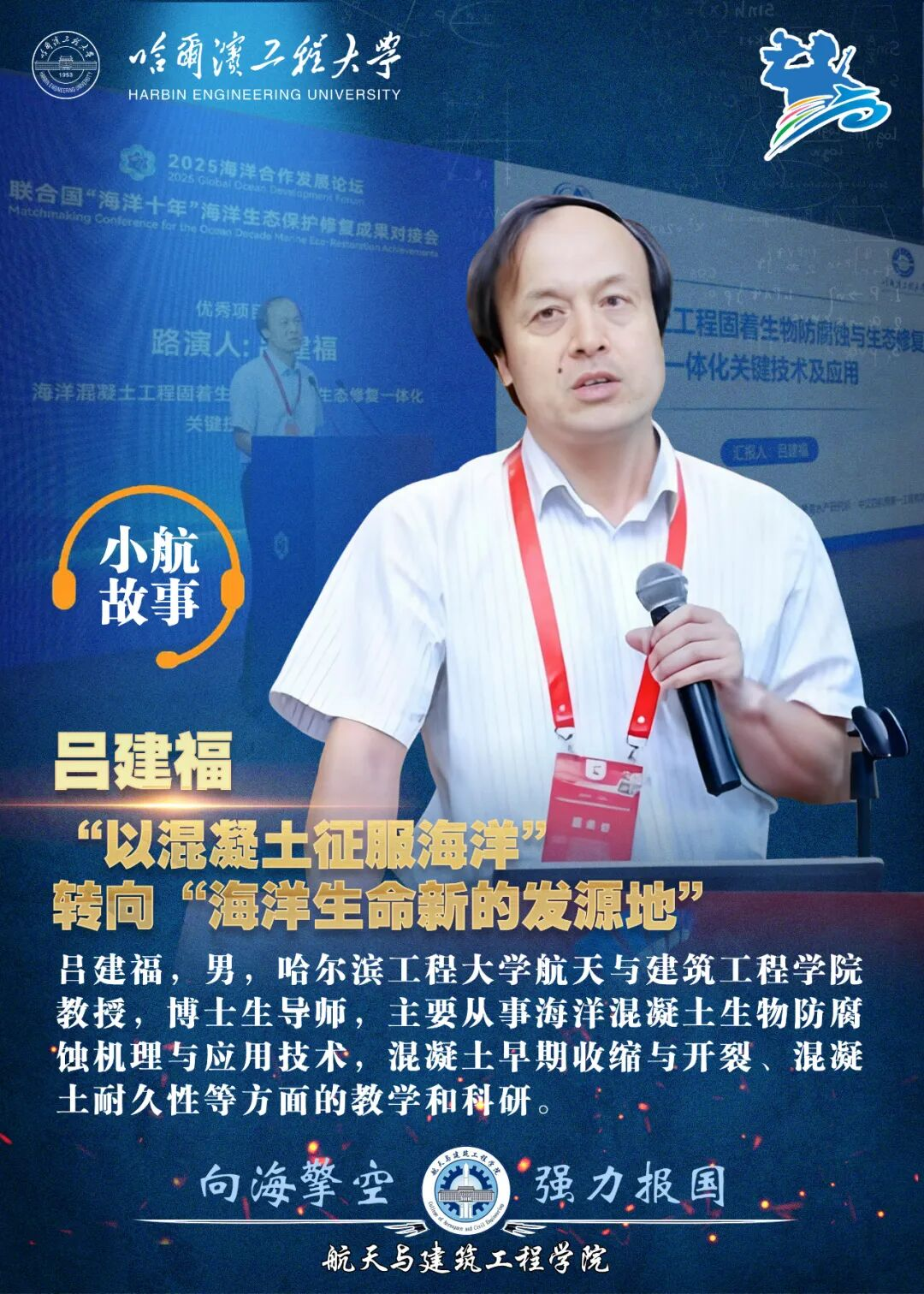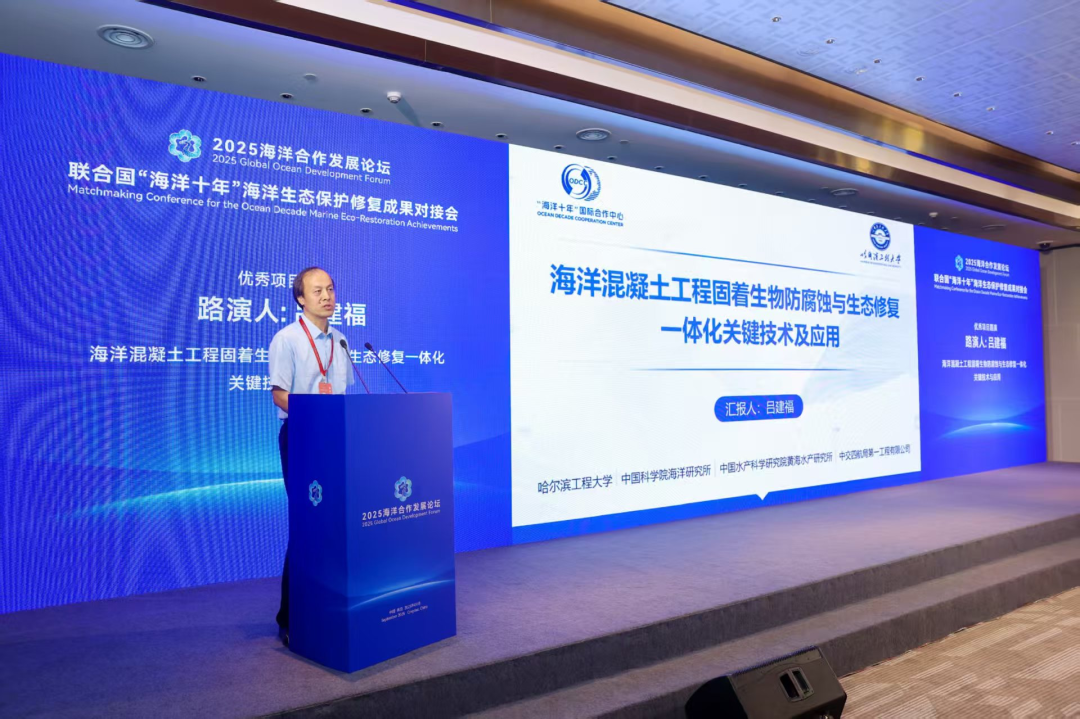 Recently, as one of the featured events of the 2025 Global Ocean Development Forum, the Matchmaking Conference for the UN "Ocean Decade" Marine Eco-Restoration Achievements was held in Qingdao. The project "Key Technologies and Applications for Integrated Anti-Corrosion of Fouling Organisms and Ecological Restoration in Marine Concrete Engineering", hosted by Professor Jianfu Lü from the Department of Civil and Environmental Engineering in the College of Aerospace and Civil Engineering of Harbin Engineering University, won the "Ocean Decade" China Initiative International Cooperation Seed Fund Major Project (only 4 projects worldwide) in the Innovative Technology Track of the first UN "Ocean Decade" Marine Eco-Restoration Competition.The project was also rated as an outstanding project of the competition andwas invited togive a roadshow presentation. Harbin Engineering University was the only leading university in China in this track to give an on-site roadshow presentation.