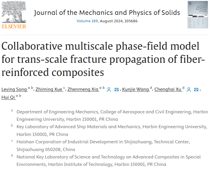Recently, the top journal insolid mechanics Journal of the Mechanics and Physics of Solids published a study on the collaborative multiscale phase-field method for trans-scale fracture analysis of fiber-reinforced composites, conducted by the Department of Engineering Mechanics in College of Aerospace and Civil Engineering of Harbin Engineering University,incollaboration with the National Key Laboratory of Special-Environment Composite Materials Technology in Harbin Institute of Technology. A Collaborative Multiscale Phase-Field (CMPF) model was proposed: a phase-field analysis model for crack propagation and evolution of multiphase materials including fiber bundles, matrix and interfaces was established at the microscale, while a phase-field analysis model distinguishing between axial and transverse fracture modes was developed at the macroscale. Bridging technique was adopted to realize information exchange between macroscopic load states and microscopic crack propagation. Taking the tensile model of needled carbon/carbon composites as an example, the study demonstrated the complete failure evolution process of tracking cracks from initiation and propagation within microscale component materials to macroscale fracture. Theresearch revealed the correlation between the macroscopic nonlinear constitutive behavior of materials and the trans-scale crack propagation process, and further calculated and analyzed the influence mechanism of needling process parameters on material mechanical properties. The title of the paper is "Collaborative multiscale phase-field model for trans-scale fracture propagation of fiber-reinforced composites".