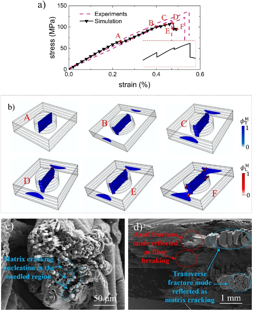The macroscale analysis model can reflect the correlation between microscale crack propagation and the overall performance degradation of the material. The calculation results show that several local unloading phenomena occur during the loading process until the material completely loses its load-bearing capacity. The crack propagation process corresponding to the local unloading of the curve is as follows: the transverse fracture mode of fiber bundles nucleates first in the needled region, whichcorresponds at the microscaleto theonset ofmatrix cracking. These matrixcracks propagate to the boundary of the needled region and are stopped there, ending the local unloading. Once the cracks are halted, the material gradually recovers its load-bearing capacity; the matrix cracks in the needled region deflect and propagate to a certain extent along the boundary of the needled region; the transverse fracture of fiber bundles nucleates and propagates in the unidirectional cloth layer; the axial fracture of fiber bundles nucleates in the 0° unidirectional cloth layer, which maps to the microscale as fiber filament breaking. At this time, the macroscale model completely loses its load-bearing capacity and the load-bearing curve drops; the gradual decline of the load-bearing curve corresponds to the continuous nucleation and propagation of axial fracture of fiber bundles. The calculation results are in good agreement with the experimental load-bearing curve and the fracture morphology of the specimen observed by SEM. The CMPF model proposed in this study can well characterize the complex trans-scale crack propagation process in fiber-reinforced composites and reveal the correlation mechanism between material loading and crack propagation.