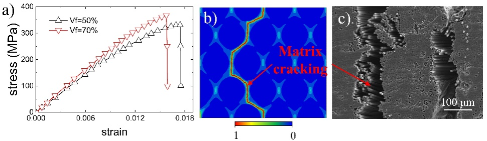 Figure 3 Fracture behavior of the transverse main axis at the microscale: a) Stress-strain curve; b) Matrix cracking fracture mode; c) Matrix cracking fracture mode observed by SEM experiment