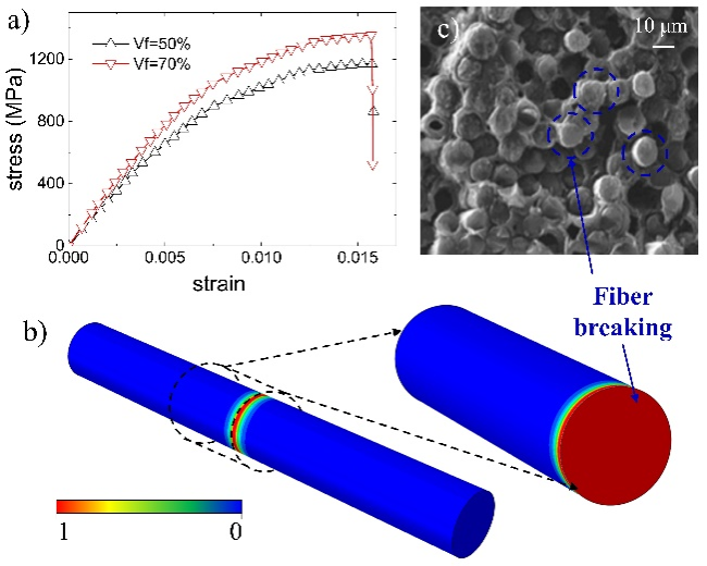 Figure 2 Fracture behavior of the axial main axis at the microscale: a) Stress-strain curve; b) Fiber filament breaking; c) Fiber filament breaking observed by SEM experiment